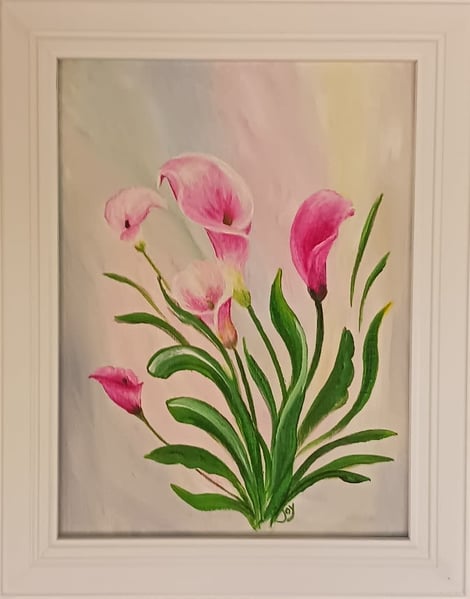 This lovely, light-hearted Calla Lily bouquet is painted in acrylics, is 9×12″ and it’s framed; ready for you to add to your decor!
