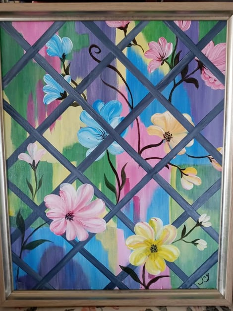What fun I had gathering this colorful collection of flowery shapes entwined in a lattice! Acrylic paint, 16×24″